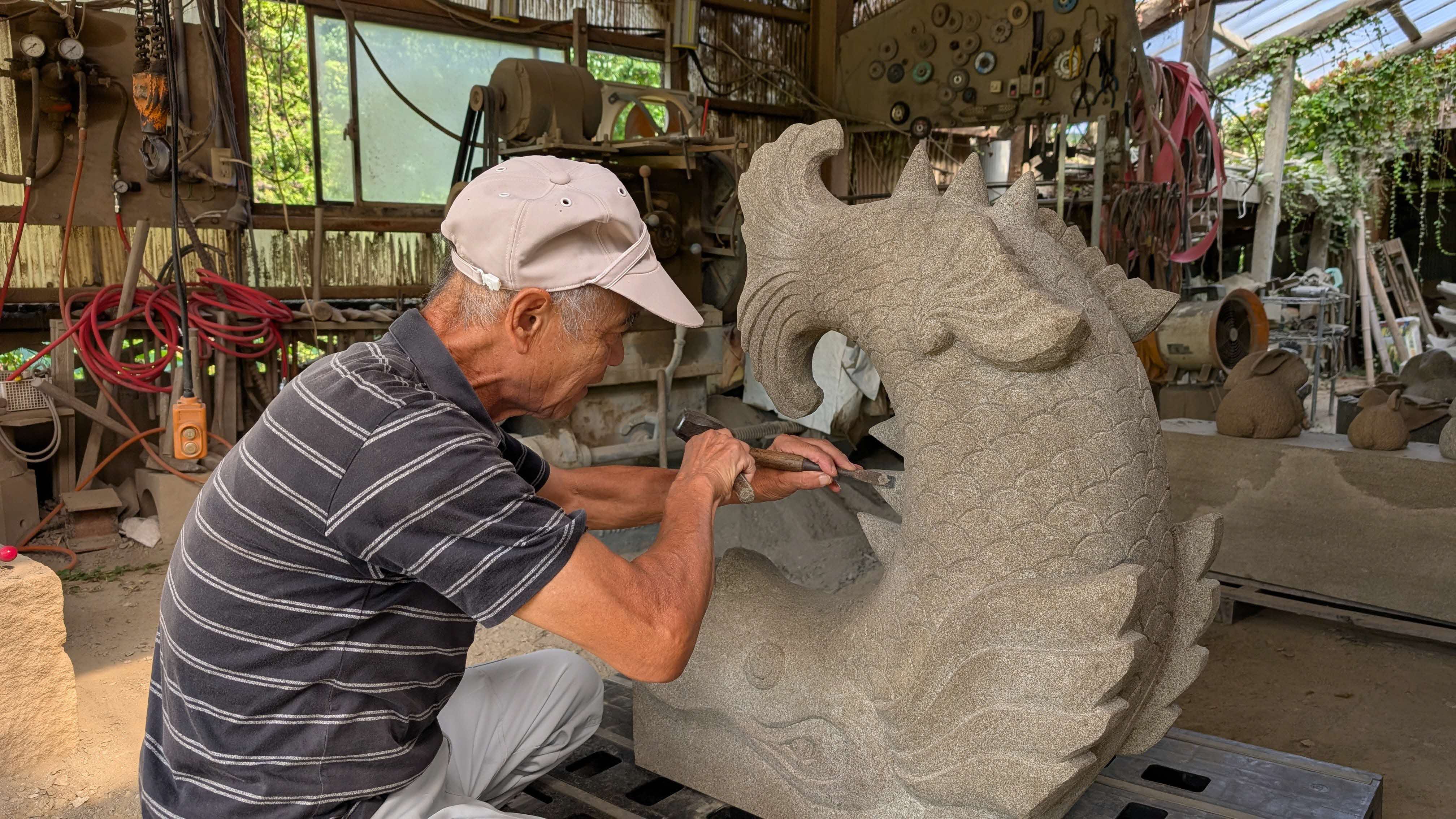 来待石の加工においては、様々な作業を一人でこなし、その高いスキルと製作スピードで数多くの作品を生み出しています。細工物の注文も多く寄せられ、年齢を感じさせない情熱と技で、今もなお第一線で活躍しています。