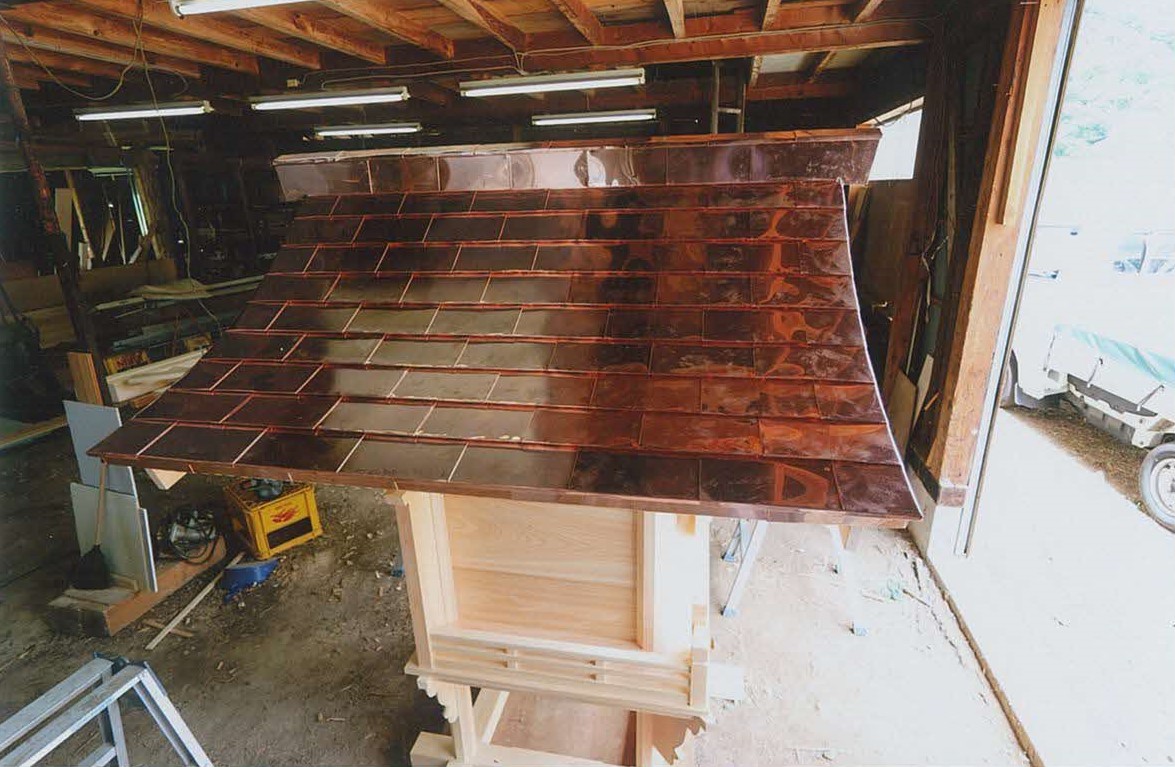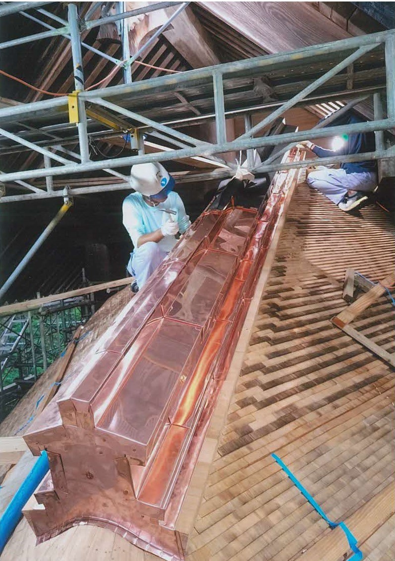 「現代の名工」の𠮷水博氏の指導のもと、難度の高い技術・工法・納め方を学び、その技法を受け継ぎ、多数の社寺建築の銅板工事をそつなく見栄え良く仕上げています。